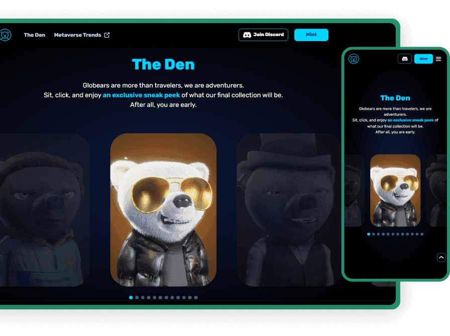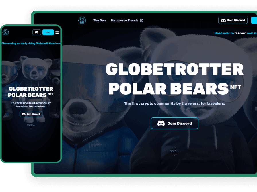 This custom made interface built in React served as the gateway to the collection of 7878 unique Globetrotter Polar Bear NFTs.