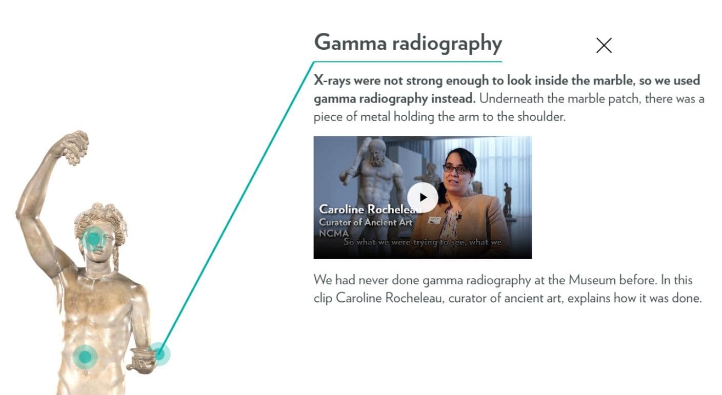 In collaboration with people from Scansite3D, who together with the NCMA created the 3D models of the statue, we were able to create a local web application that every visitor of the museum can intuitively explore and get the information about Bacchus - all in one place.